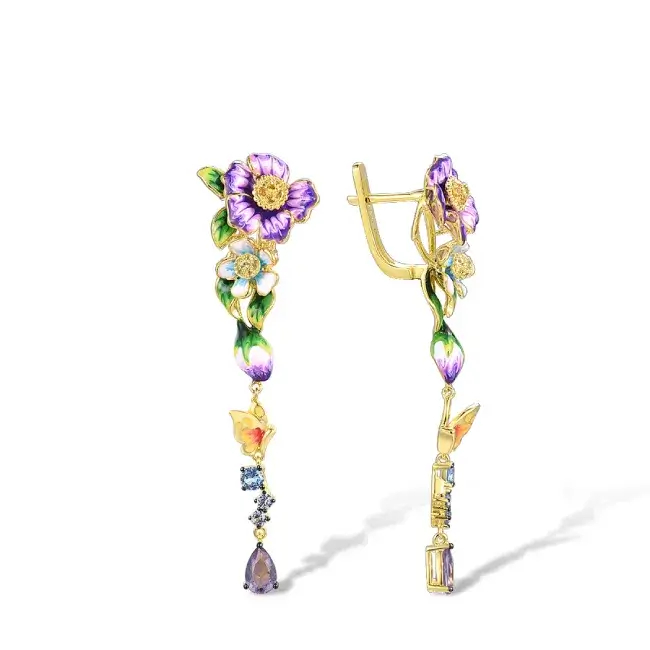 🌸 Ces boucles d’oreilles multicolores pendantes en argent sterling 925 plaqué doré introuvables et romantiques, ornées de délicate fleurs violette, bleu et blanc aux nuances givrées et superposées et complétées par une pierre scintillante, sont parfaits pour les femmes à la recherche d’un style unique et intemporel.